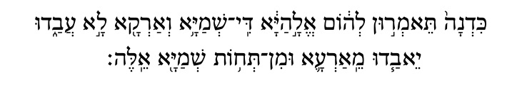 But why Aramaic? As the Targums and other commentators argue, Jeremiah has in mind the Jews in exile. The Targum to Jeremiah may be correct: verse 11 may be part of a letter sent to the elders already in exile. Whether or not the verse is part of a letter, Jeremiah is instructing those in Judah on what to say when they are in exile. Jeremiah’s instruction is evident by the wording of verse 11. “Thus you shall say”: the “you” of this clause refers to the Jews to whom Jeremiah is speaking (10:1). “To them”: this refers to the Babylonians, the very people the Jews live among in exile (8:19; 10:17-18). Jeremiah, then, is saying, “Thus you, O Jews, shall say to the Babylonians—the people you live among—when they tempt you to worship idols (10:2) . . .” The question remains, could Jeremiah have accomplished the same purpose in Hebrew?